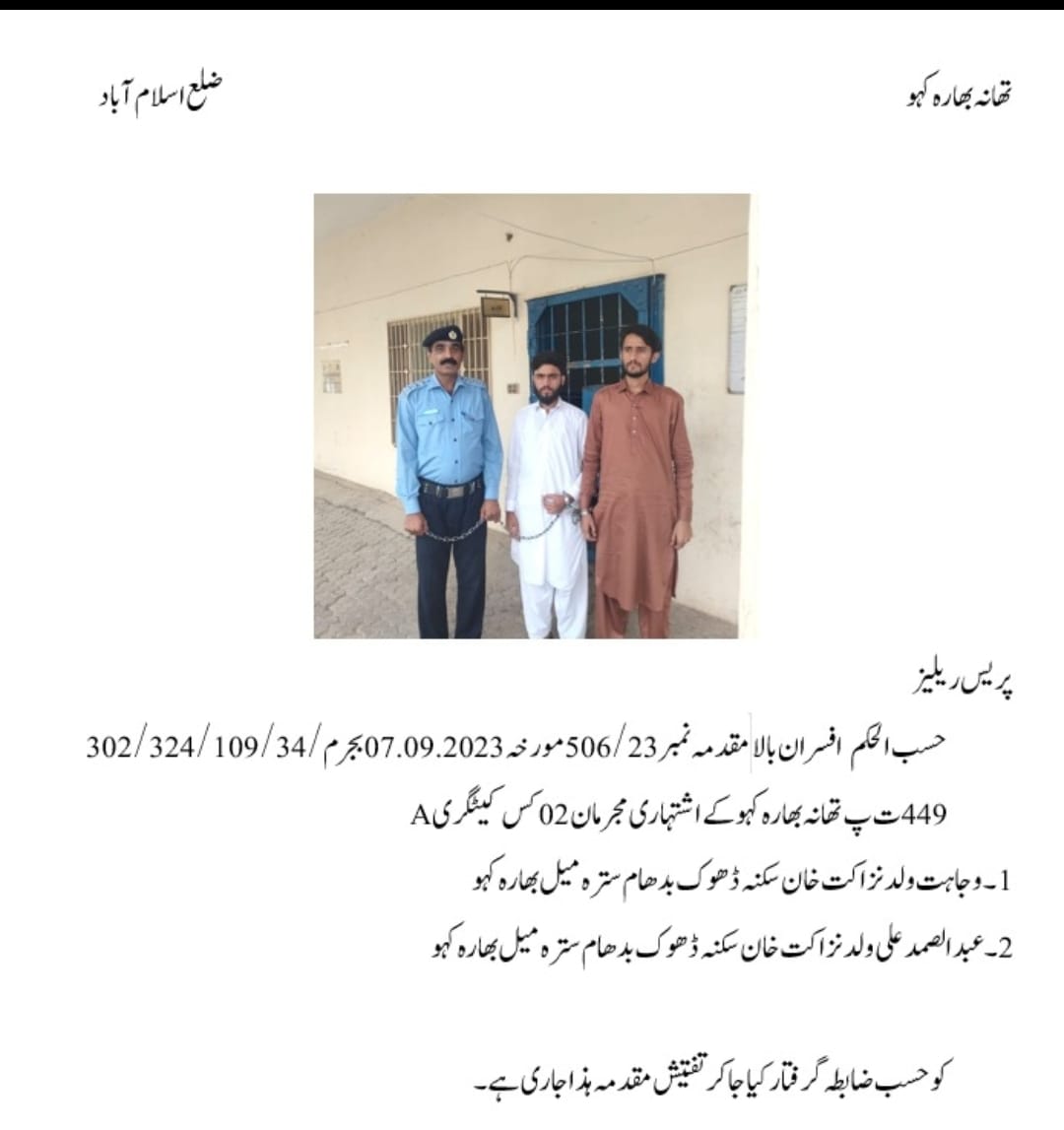 اسلام آباد (بگ ڈیجٹ) ایس ایچ او تھانہ بہارہ کہو چوہدری اختر زمان کی پہلی کامیاب کروائی 2023 کے قتل کے مقدمے میں ملوث خطرناک اشتہاری ملزمان گرفتار