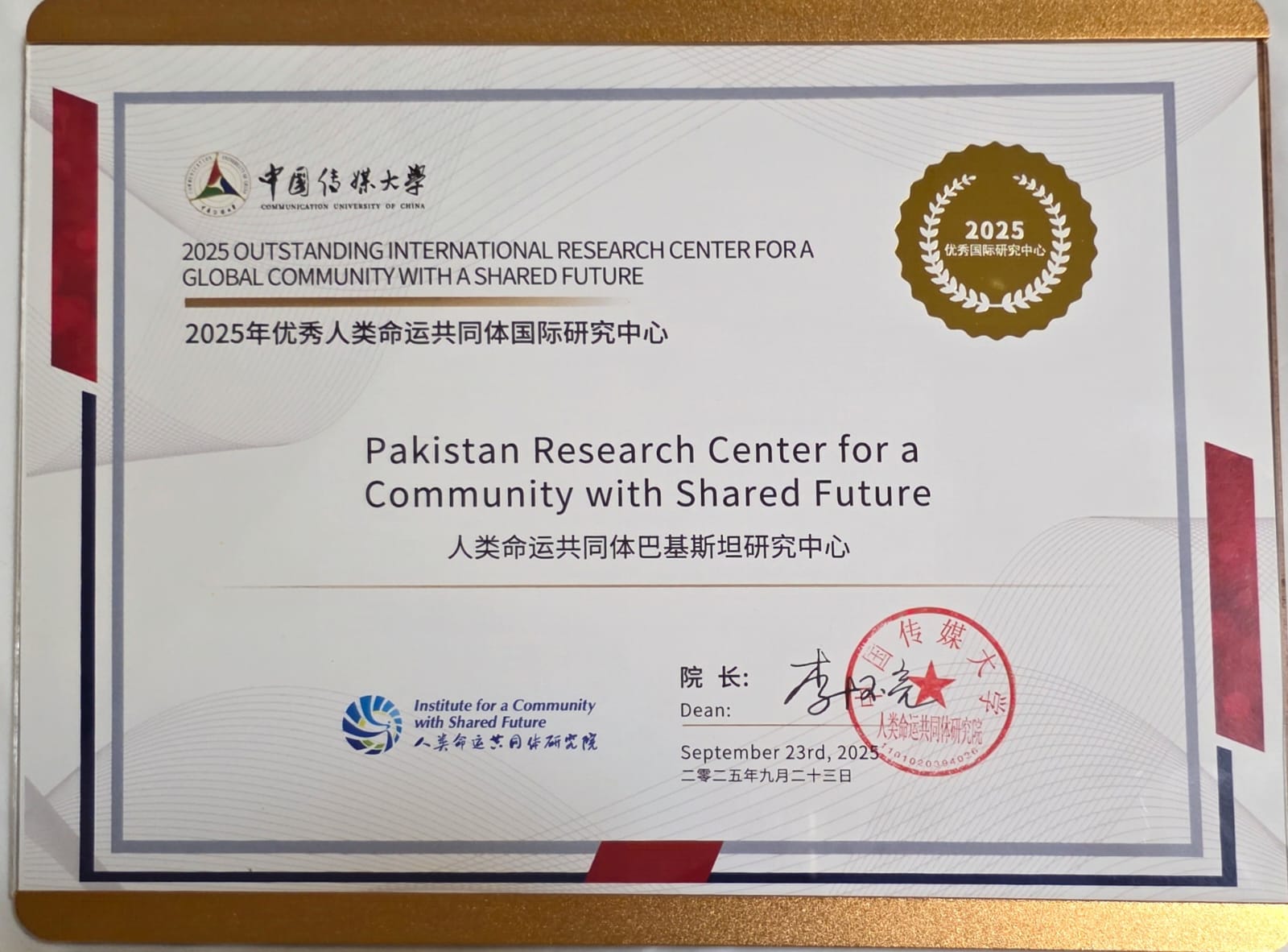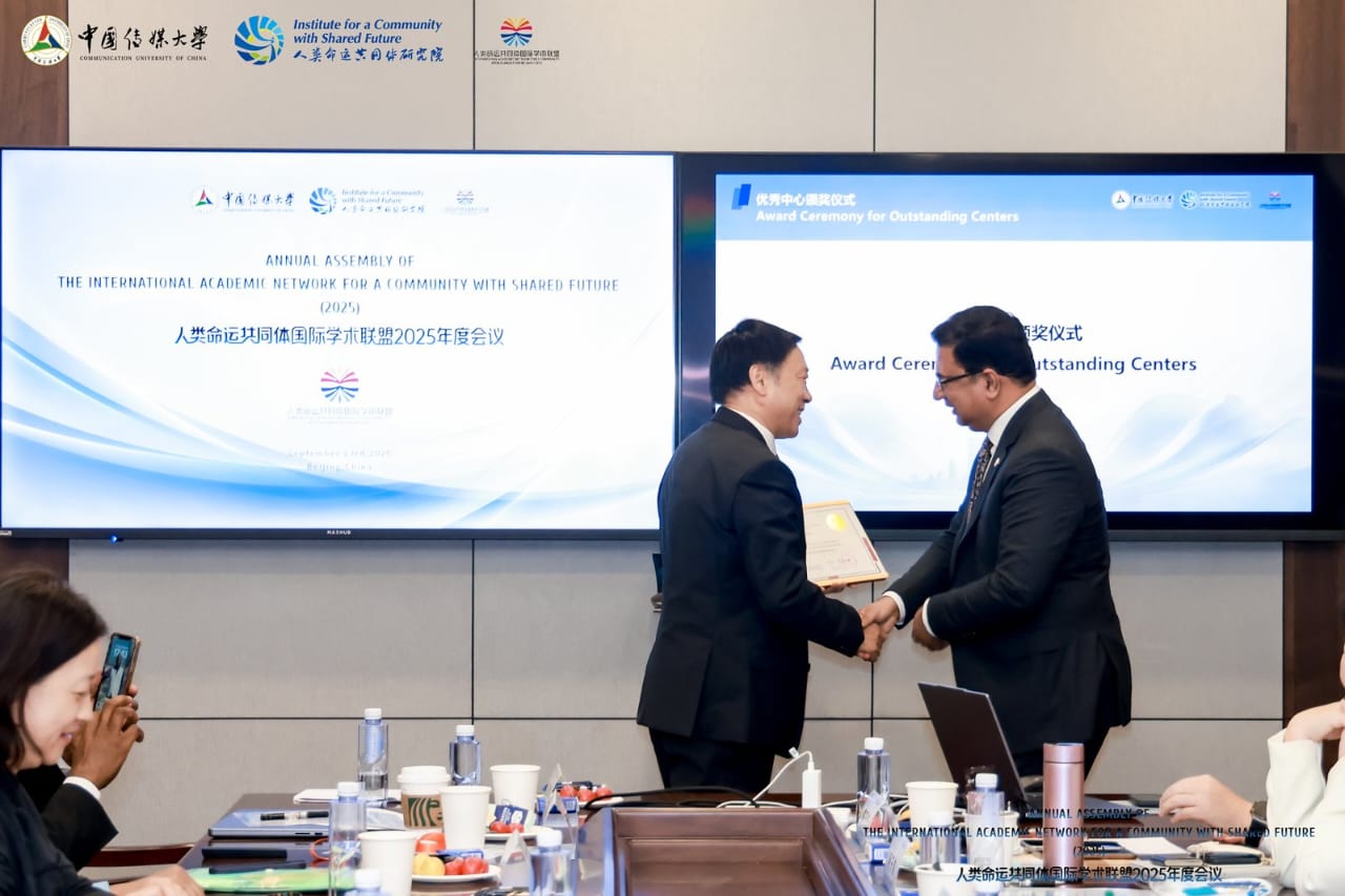 A key segment of the Assembly was the exchange of work experiences and future plans, during which center directors shared insights and strategies from their respective regions. This was followed by a celebratory awards ceremony recognizing Outstanding International Centers, in which the Pakistan Research Center for a Community with Shared Future (PRCCSF) got the top prize in recognition of its exemplary contributions over the past five years across the 23 countries.