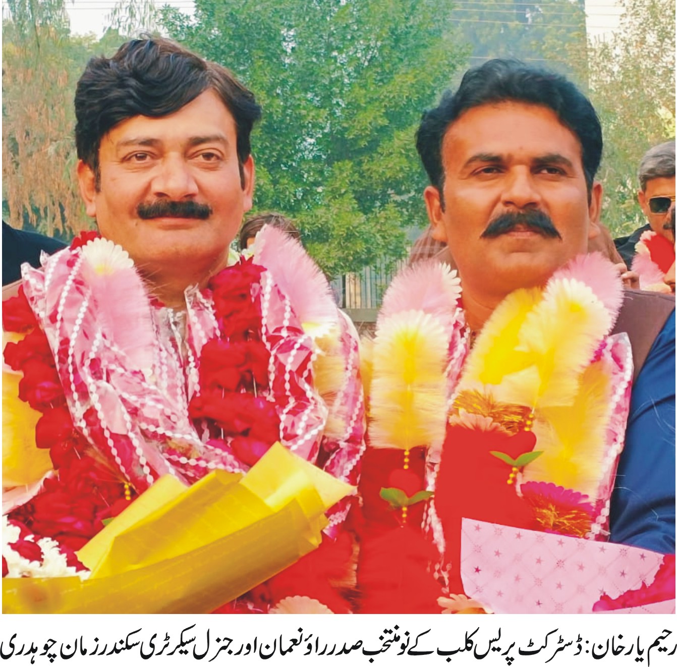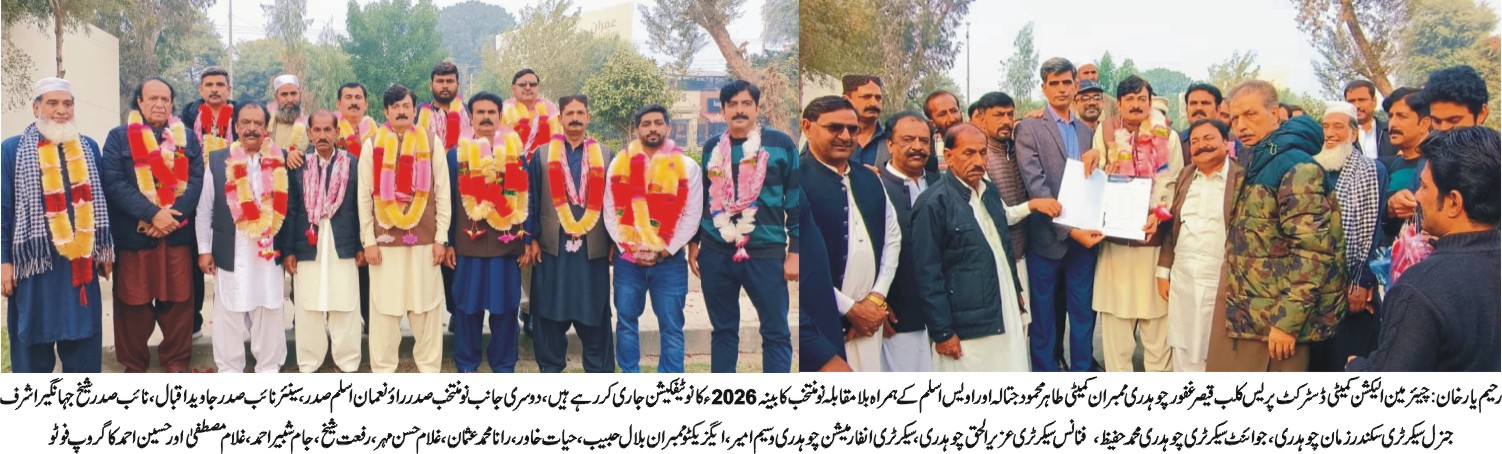 تفصیل کے مطابق ڈسٹرکٹ پریس کلب(رجسٹرڈ) رحیم یارخان کے سال 2026ء کے انتخابات کے نتائج کااعلان گزشتہ روزچیئرمین الیکشن کمیٹی قیصرغفورچوہدری نے ممبران الیکشن کمیٹی طاہرمحمودجتالہ اوراویس اسلم کے ہمراہ سہ پہر3بجے ڈسٹرکٹ پریس کلب کے سبزہ زارمیں ممبران پریس کلب وامیدواران کی موجودگی کیاجس کے مطابق راؤنعمان اسلم صدر، جاویداقبال سینئرنائب صدر، شیخ جہانگیراشرف نائب صدر، سکندرزمان چوہدری جنرل سیکرٹری، چوہدری محمدحفیظ جوائنٹ سیکرٹری، عزیرالحق چوہدری فنانس سیکرٹری، چوہدری وسیم امیرسیکرٹری اطلاعات جبکہ بلال حبیب، حیات خاور، رانامحمدعثمان، غلام حسن مہر، رفعت شیخ، جام شبیراحمد، غلام مصطفیٰ اورحسین احمدممبرایگزیکٹوکمیٹی بلامقابلہ منتخب قرارپائے، واضح رہے کہ کامیاب امیدواران کے مقابلے میں کسی دوسرے امیدوارکے کاغذات نامزدگی نہ آئے تھے جس کی بنیادپرالیکشن کمیٹی نے تمام اہل امیدواران کوبلامقابلہ کامیاب قراردے کرنوٹیفکیشن جاری کردیا، نوٹیفکیشن دینے کی تقریب میں ممبران پریس کلب، عمائدین شہرکی بہت بڑی تعدادنے شرکت کی اعلان ہوتے ہوئے کامیاب صدر، جنرل ودیگرعہدیداران کے حق میں بھرپورنعرے بازی وگل پاشی کی گئی، ڈھول کی تھاپ پربھنگڑے ڈالے جانے کے ساتھ ساتھ کامیابی امیدواران کوحامی ودوست گلے لگاکرمبارک بادیں پیش کرتے رہے،